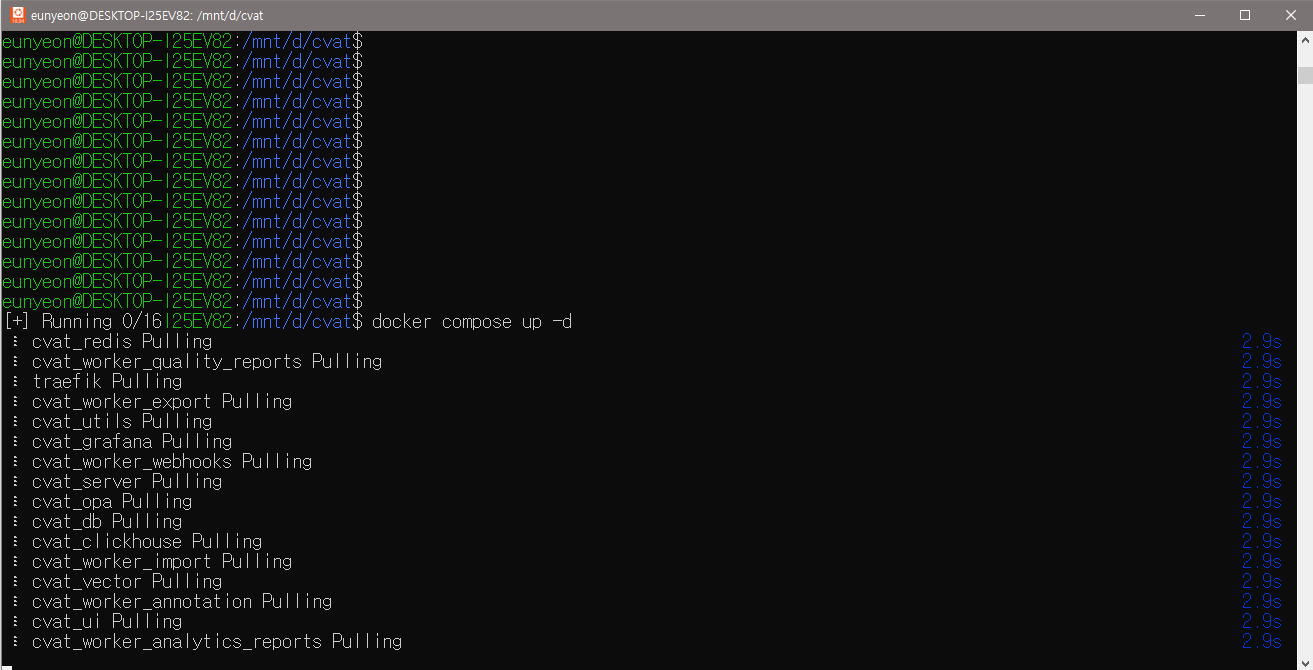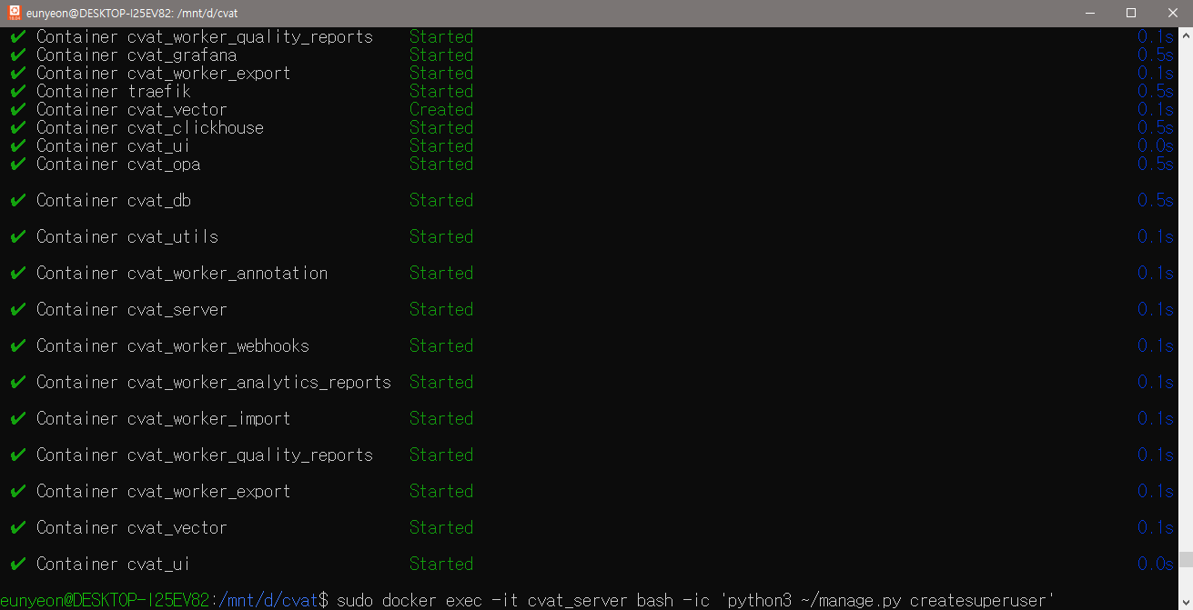 이전과 마찬가지로 ubuntu 터미널 - /mnt/d/cvat 경로에서 아래 명령어를 한 줄씩 입력 후 실행합니다.