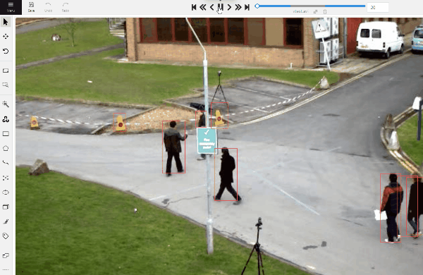 보행자들에게 자동으로 person이라는 레이블로 rectangle shape가 생성되었습니다!