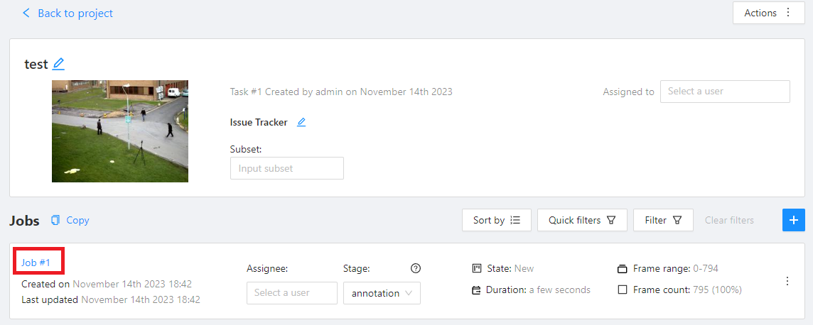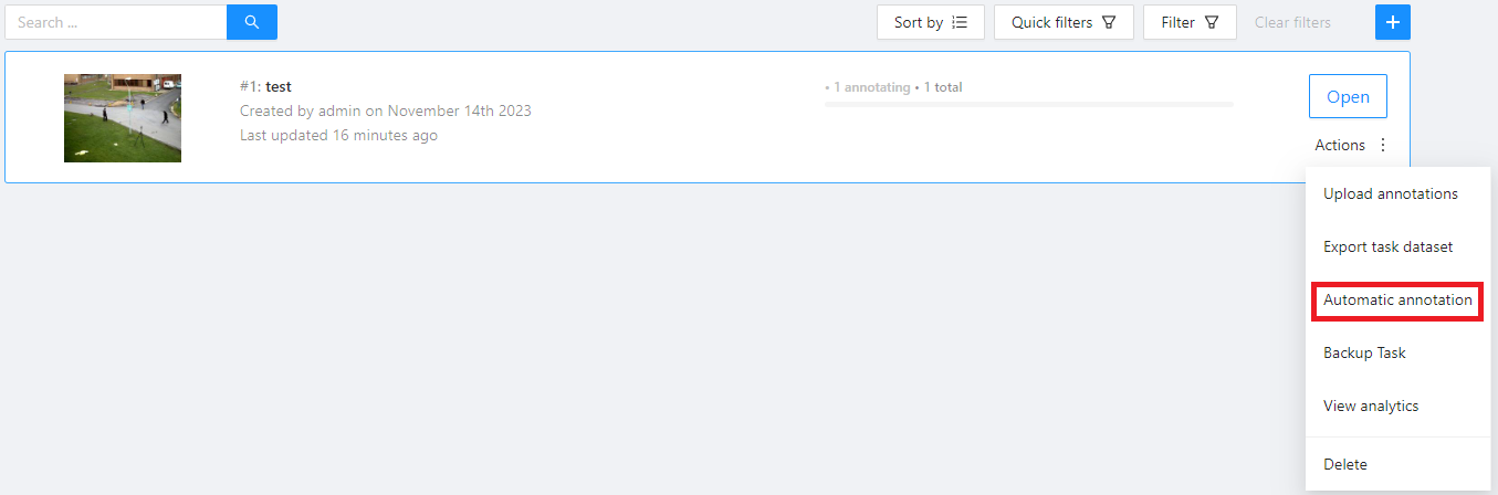 영상 전체에 레이블링을 해보겠습니다. Tasks 메뉴에 들어간 후 생성한 task 오른쪽의 Actions 에 마우스를 올린 후 Automatic annotation을 클릭합니다.