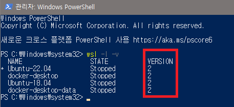Ubuntu 실행 후 wsl.exe -l -v를 입력하여 아래와 같이 18.04의 wsl version이 '2'임을 확인합니다.