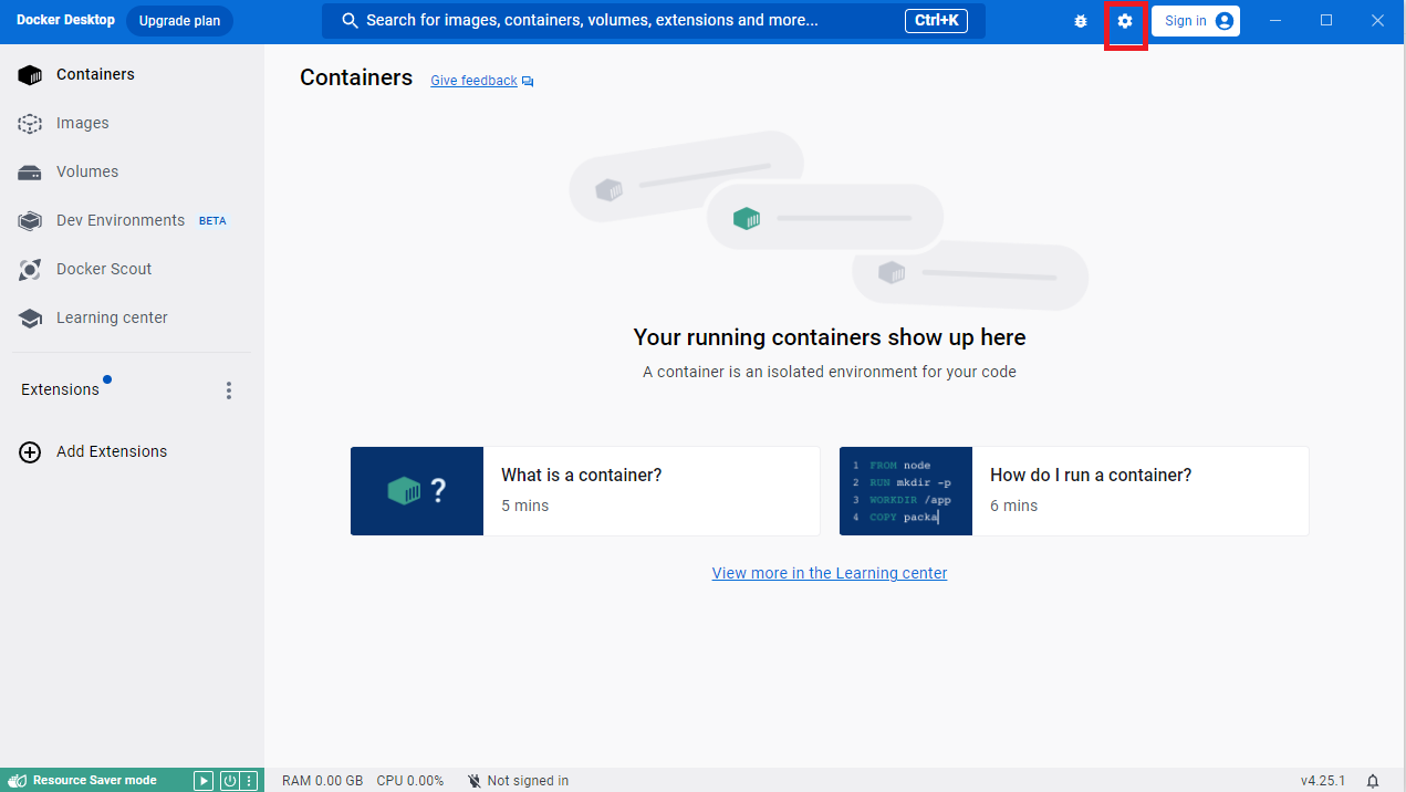 Docker 실행 화면입니다. 아래 그림에서와 같이 오른쪽 위를 보시면 Settings 아이콘이 있습니다. 눌러주세요.