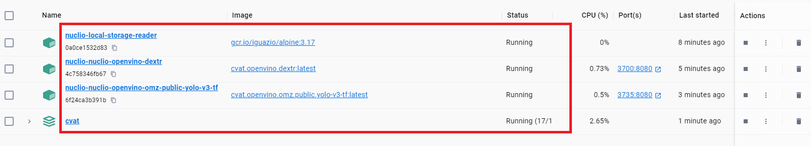 Docker 컨테이너를 확인해보면 nuclio 모델 및 storage가 추가된걸 확인 할 수 있습니다.