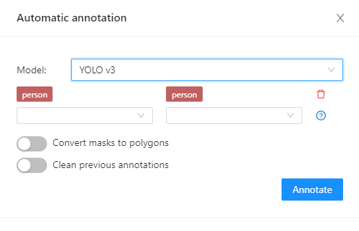 좌측 메뉴 중 AI Tools를 누르고 Detectors에서 Model: YOLO V3를 선택합니다. 제가 person이라는 라벨을 이미 생성해 놓았기 때문에 자동으로 person - person으로 매칭되어 있습니다. Annotate를 진행합니다.