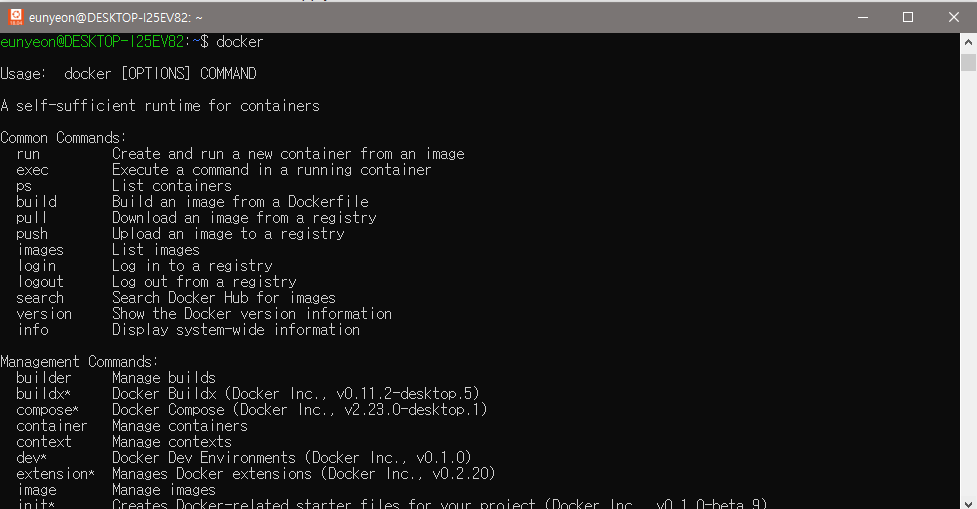 이제 WSL Ubuntu 18.04 환경에서 Docker 명령어를 사용 할 수 있습니다.